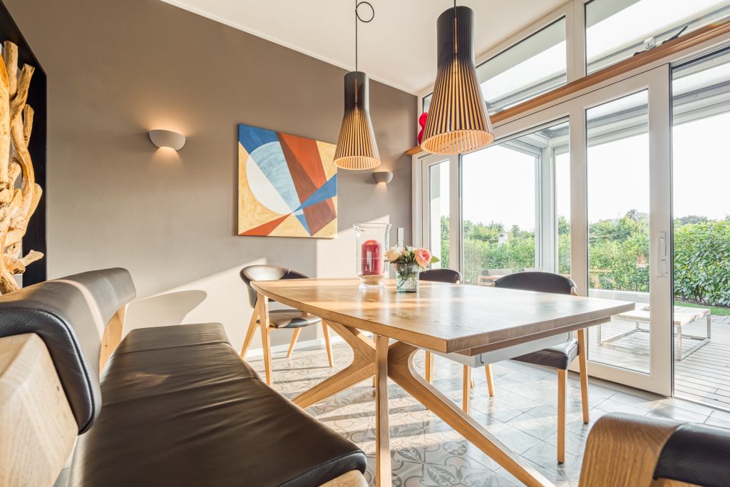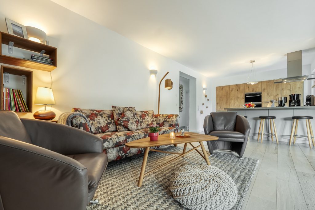 Ein ca. 58 qm großer Raum mit offener Küche und Küchenblock, moderner Sitzecke, Stereoanlage, Sat-TV, E-Piano, Essbereich, exklusivem Kamin und direktem Zugang auf zwei Terrassen.